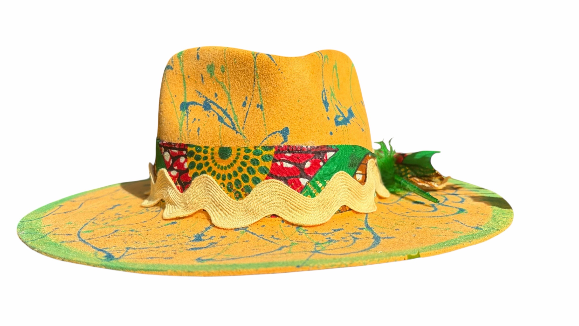 Introducing our vibrant Yellow and Green Splattered Paint Fedora – a stylish accessory that effortlessly blends elegance with a splash of artistic flair. Crafted from 100% Australian wool, this fedora not only assures exceptional quality and warmth but also showcases intricate splatters of paint that add a unique and eye-catching element to your outfit.
